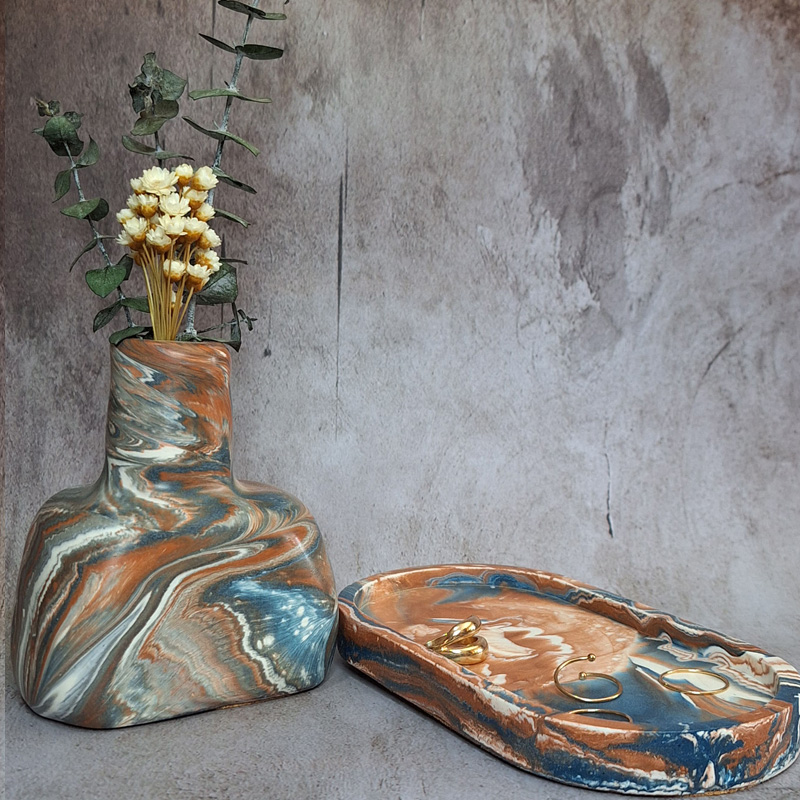 El marmoleado es otro de los efectos que se consigue con este material, mezclando resinas de diferentes colores, que al verterlas en los moldes crea diferentes vetas.